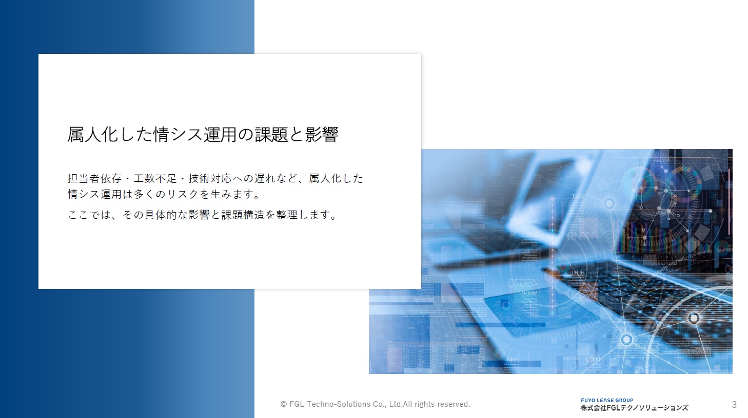本書では、属人化によって情シスが抱える課題の全体像と、担当者への負荷を抑えながら“攻めのIT”へ転換するための3つのステップを解説します。