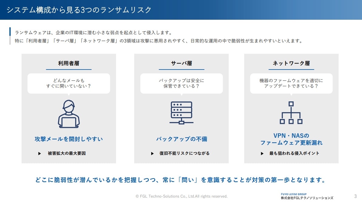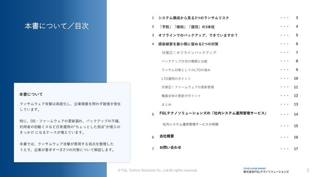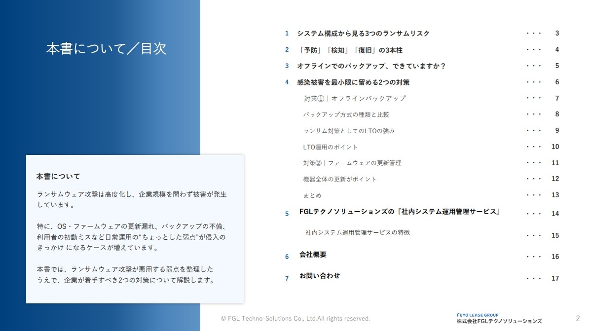 ランサムウェア攻撃は高度化し、企業規模を問わず被害が発生 しています。 本書では、ランサムウェア攻撃が悪用する弱点を整理した うえで、企業が着手すべき2つの対策について解説します。