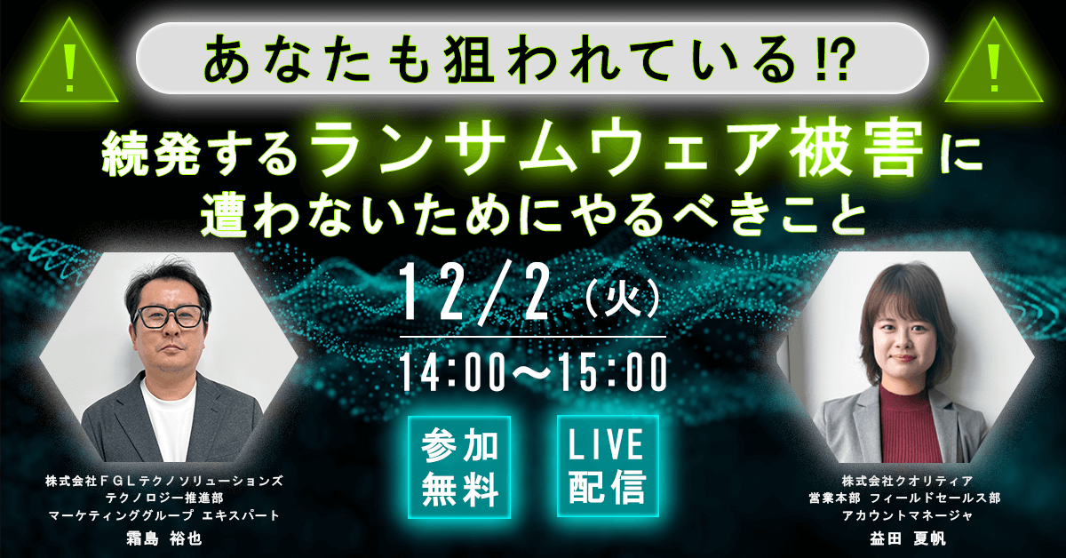 株式会社クオリティア(本社:東京都中央区、代表取締役:松田 賢、以下「クオリティア」)は、株式会社FGLテクノソリューションズ(本社:東京都江東区、代表取締役社長:湯浅 敏之、以下「FGLテクノソリューションズ」)と共に12月2日(火)に「あなたも狙われている!?続発するランサムウェア被害に遭わないためにやるべきこと」と題したウェビナーを開催いたします